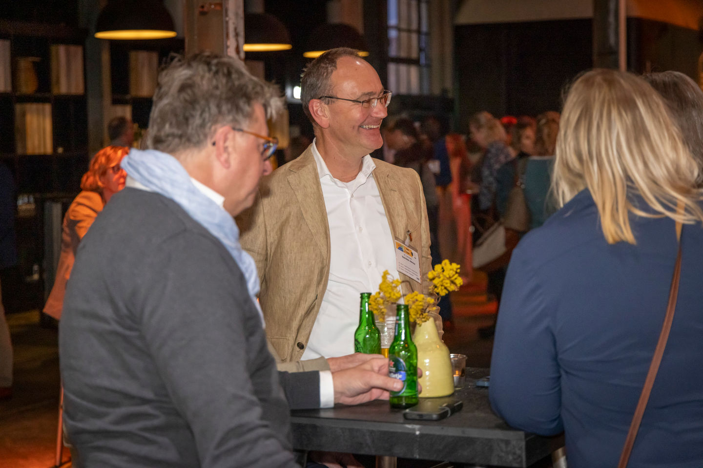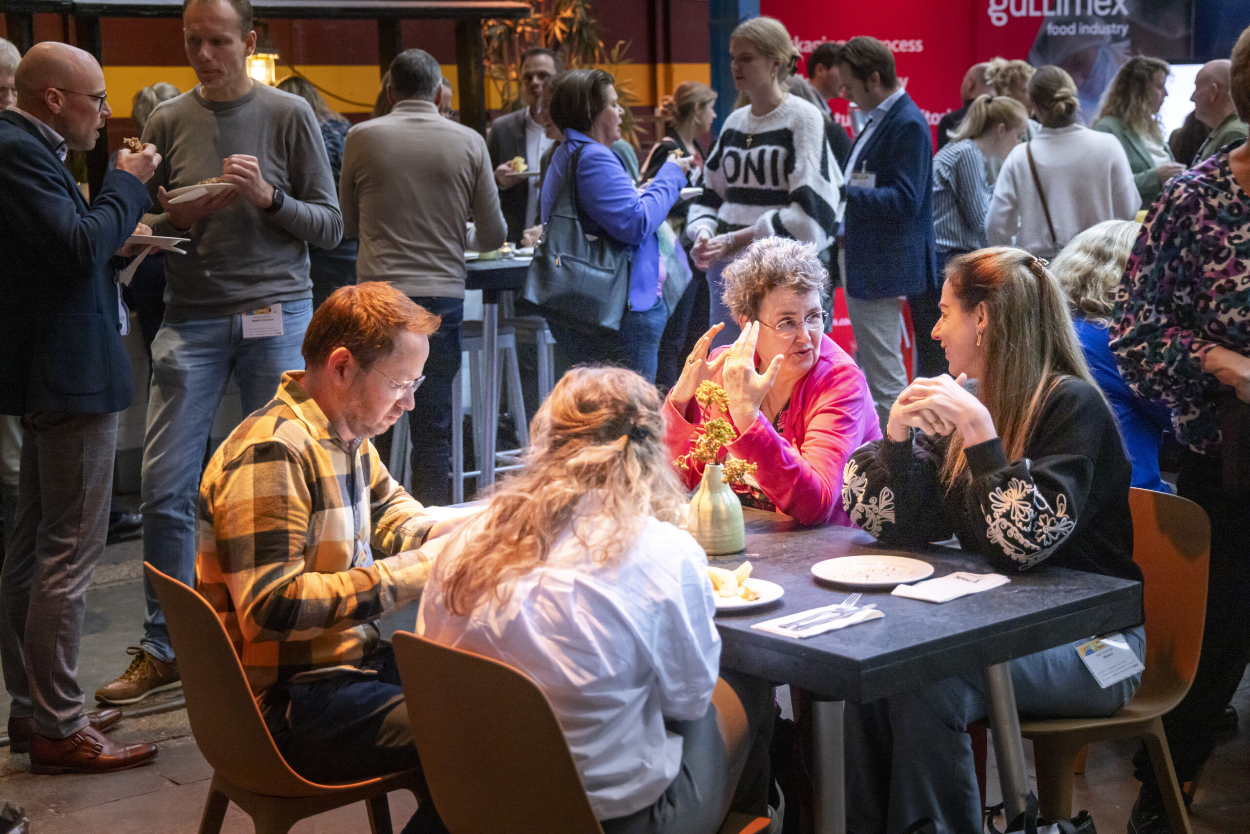 Het laatste inhoudelijke onderdeel was een interactieve paneldiscussie over certificering en standaarden in de voedingsindustrie. Aldin Hilbrands (FSSC), Miran Ismael (European Cerification Center for Halal), Roos de Roo (RedCow Food Consultancy), Ard van der Woude (Précon) & IJsbrand Velzeboer (Scienta Nova) bespreken het spanningsveld tussen regelgeving, duurzaamheid en voedselveiligheid. Na het toetje van de dag was de borrel aangebroken.