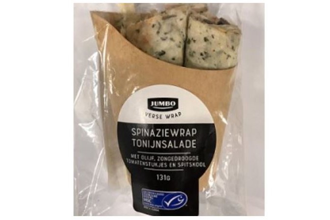 Jumbo Supermarkten haalt per direct de spinaziewrap tonijnsalade uit de schappen vanwege een mogelijk verkeerd etiket.