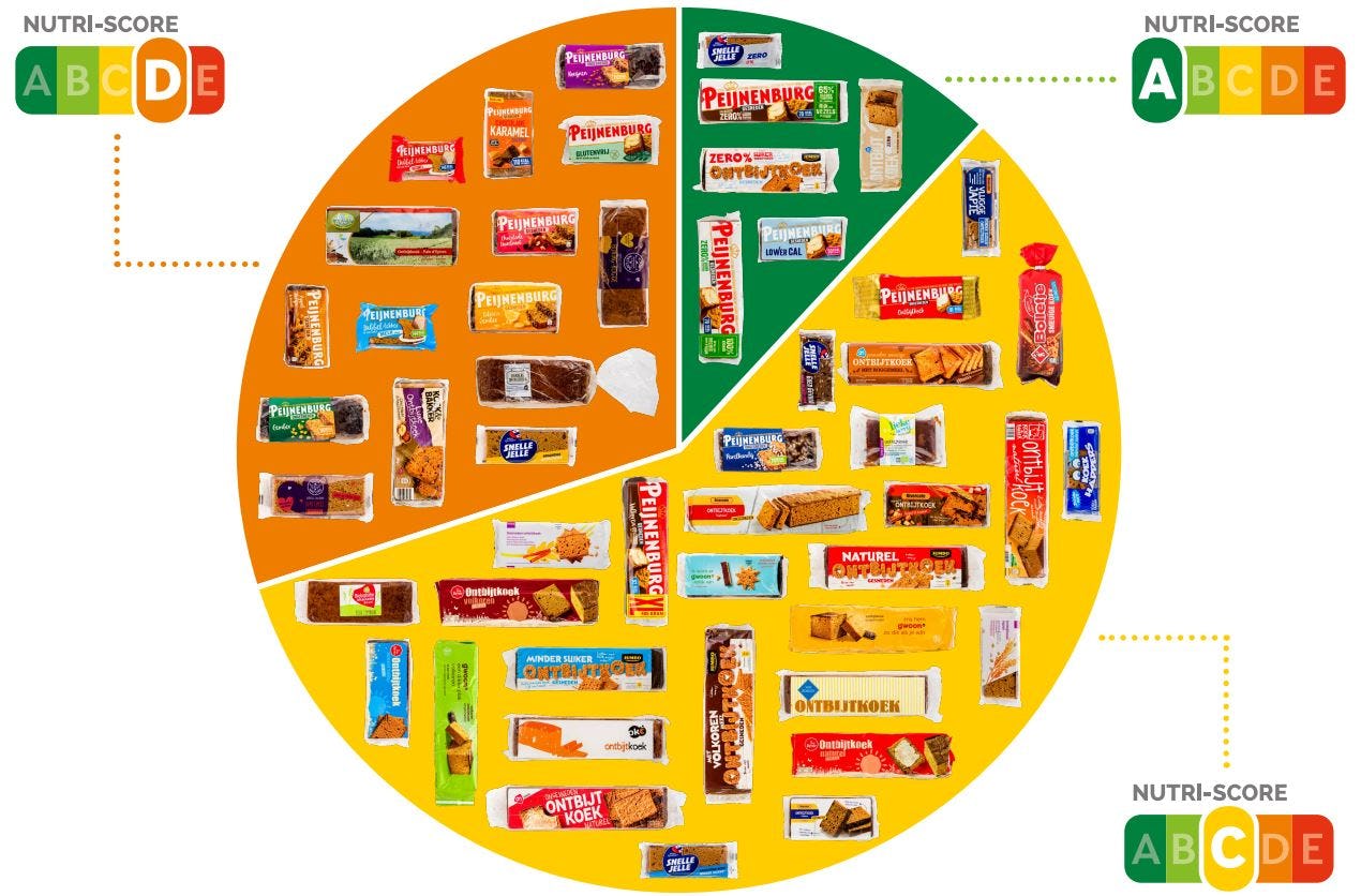 Uit onderzoek van de Consumentenbond blijkt dat de meeste ontbijtkoeken Nutri-Score C of D krijgen. Enkel 'zero%' en 'lower cal' ontbijtkoeken krijgen A-score.