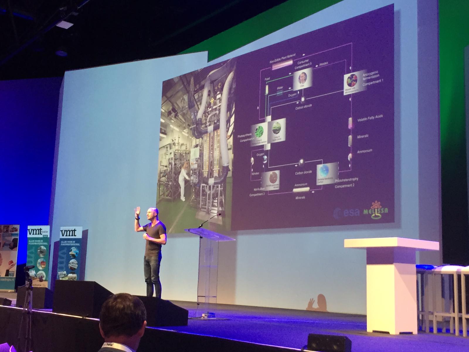 Wetenschapper en kunstenaar Angelo Vermeulen van SEAD vertelde tijdens het Food Future Event over het project MELiSSA van de Europese Ruimtevaartorganisatie ESA. In het project bestuderen onderzoekers hoe ze met bacteriën, algen, planten, chemische stoffen en natuurkundige processen van een ruimtevaartuig een gesloten ecosysteem kan maken. Zo wordt onder andere een ecosysteem gebouwd waarbij het afval van de mens (o.a. zweet en urine) wordt omgezet tot nitraat en CO2 die grondstoffen zijn voor planten waar de mens weer van kan eten.