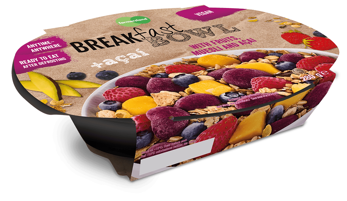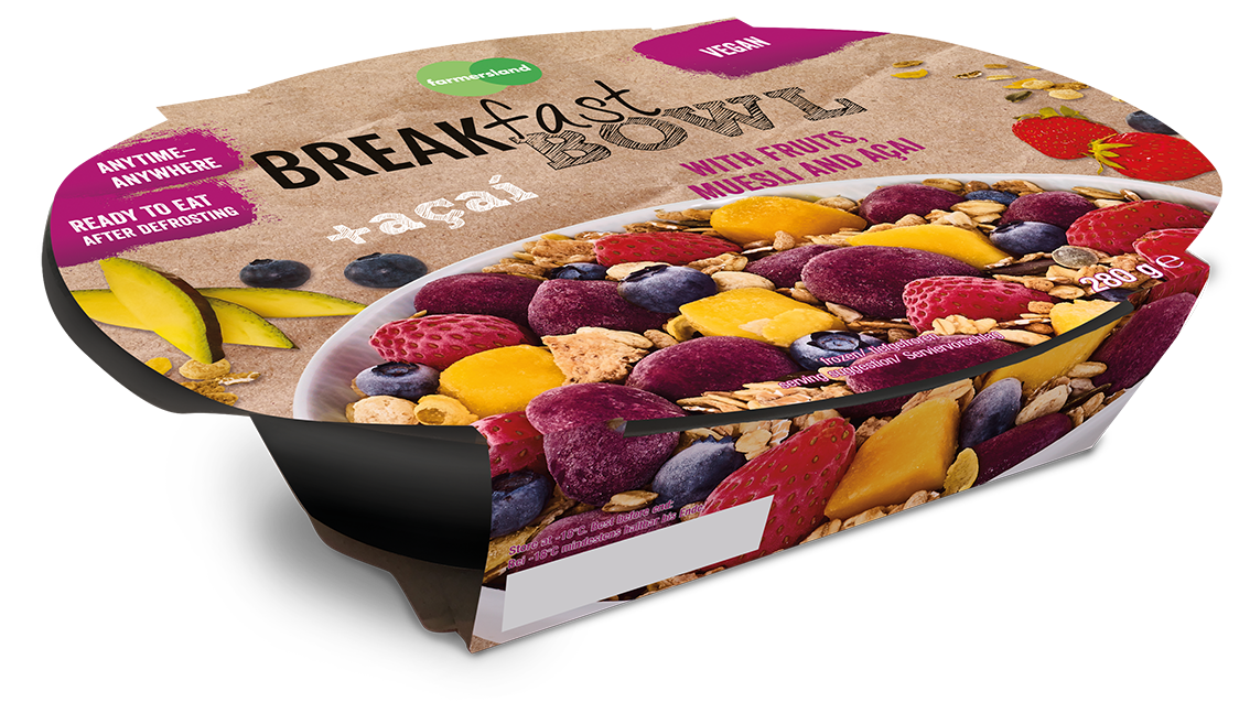 Een broodje pindakaas, muesli met yoghurt of melk en fruit of spek met eieren: dit zijn vaak de eerste gedachten die opkomen als het om een ontbijt gaat. Maar het kan ook anders vindt het Duitse Farmersland. Het bedrijf introduceerde drie varianten diepgevroren muesli's met fruit en yoghurt op de onlangs gehouden voedingsbeurs Anuga.