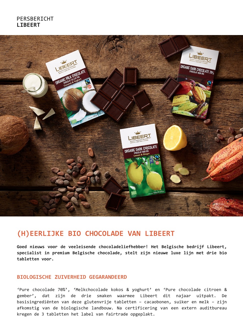 Het Belgische bedrijf Libeert ontwikkelde een nieuwe luxe lijn met drie biologische glutenvrije chocolade tabletten, die medio deze maand op de markt komen. De smaken zijn 'Pure chocolade 70%', 'Melkchocolade kokos & yoghurt' en 'Pure chocolade citroen & gember', die bij de uitreiking van de Superior Taste Awards van iTQi onderscheiden werd met twee sterren.